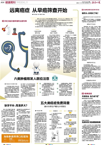 由海南省肿瘤医院承担的“国家城市癌症早诊早治项目”去年7月在海南落地实施,海口成为全省首个试点城市。该项目对肺癌、乳腺癌、肝癌、上消化道癌和结直肠癌等五大类癌症进行免费筛查,帮助百姓及早发现疾病隐患,减轻患者和社会负担。