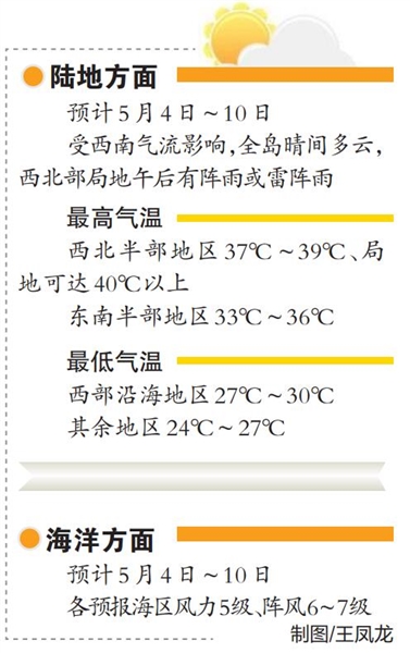 本报海口5月4日讯(记者郭萃 通讯员袁迎蕾 李凡)海南日报记者5月4日从海南省气象台了解到,本周海南全岛以晴间多云天气为主,海南岛西北部地区将维持大范围高温天气,午后局地有雷阵雨,最高气温局地可达40℃以上。
