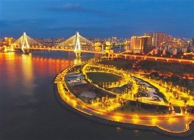 5月17日,俯瞰海口湾世纪公园夜景。近年来,海口市着力提升城市公共区域亮化水平,一方面方便了市民游客夜间出行,激活了夜经济,另一方面展示了夜海口的独特魅力,提升了城市的整体形象。本报记者 封烁 摄