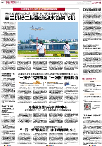 据介绍,美兰机场按照省委、省政府的谋划布局,在相关单位支持和配合下,落实超常规举措,吹响“奋力大干100天,全力冲刺6·30”的号角,较原计划提前6个月开展此次校飞工作,后续将全力以赴完成6月30日主体工程完工的节点目标,力争年内具备通航条件。