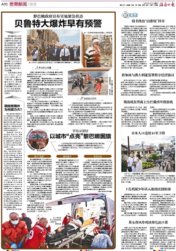 以色列特拉维夫市政府当地时间5日晚用投影在市政大楼外墙上打出黎巴嫩国旗图案,为一天前遭遇惨烈大爆炸的黎巴嫩民众打气。以黎两国处于敌对状态。作为以色列经济中心,特拉维夫市这一举动实属罕见。