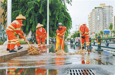 8月17日下午,海口气象台发布暴雨红色预警信号,城区北部多个路段出现积水,积水严重路段车辆无法通行。海口市政、环卫部门迅速应对,组织人员到积水严重路段加快排水,图为在海口市龙华区豪苑路,环卫工人合力清扫道路积水。本报记者 李天平 摄