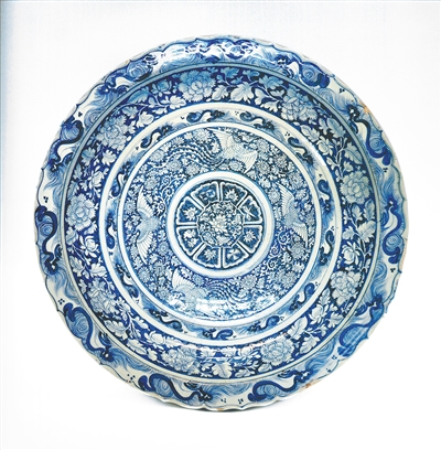 伊朗国家博物馆藏青底白花凤凰穿花纹菱口盘。