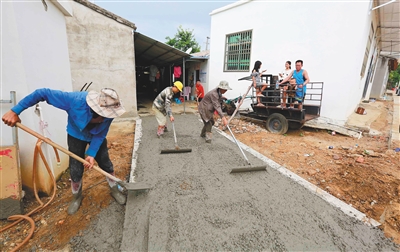 图②:近日,在东方市大田镇新宁坡村,工作人员正在硬化村道,打通扶贫“最后一公里”。