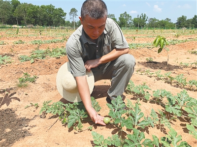 9月2日上午,黄飞顶着烈日来到产业园查看果苗的长势,藤蔓上已长出小西瓜。 本报记者 计思佳 摄