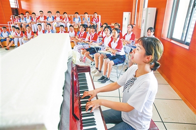 投入 北师大海口附属学校,一名音乐老师在给孩子们上音乐课,美妙的钢琴声在校园内响起。本报记者 张茂 摄
