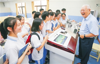 忘我 文昌中学的一间录播教室,83岁的退休教师云凰在向学生们讲述自己上世纪90年代用电脑给学生上课的情景。本报记者 袁琛 摄