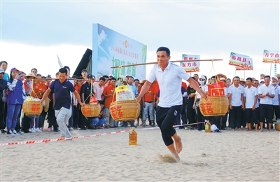 九月二十二日,中国农民丰收节海南庆祝活动在乐东黎族自治县莺歌海镇亲水广场举行。图为农民代表在参加趣味接力项目比赛。 本报记者 武威 摄