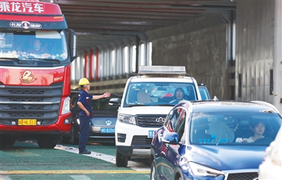 图为9月30日,在海口新海港,港口工作人员引导非琼籍车辆有序进入港口。