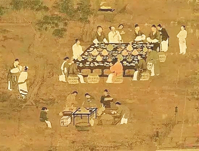 明代国画中重阳节当天,皇宫上下一起吃花糕以庆。