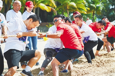 10月31日上午,“助力亚沙会——沙滩运动体验活动”在三亚大东海沙滩举行。参加沙滩拔河挑战的选手卖力拔河。 本报记者 封烁 摄