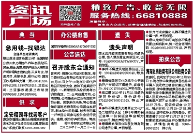 曾庆河:根据《公司法》的规定,海口陈林实业有限公司定于2020年12月25日上午10时在公司住所地召开股东大会,就如下提案进行表决:一、新增股东及股权持有比例的确定。二、公司经营方向、公司章程、公司是否分立及相应财产的分割。因联系你未果,特公告通知你届时将持有的公司营业执照正、副本及公司印章、财务专用章一并带回公司参与股东会进行表决。逾期,视为你弃权表决。特此通知 海口陈林实业有限公司