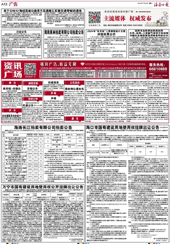 受委托,定于2020年12月28日10:00在本司拍卖厅公开拍卖以下标的:位于乐东黎族自治县抱由镇公安局老看守所33.0592亩土地及地上的建筑物。参考价:3510万元/整体,竞买保证金:1500万元。