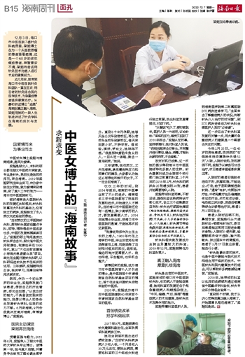 仅仅三年的时间,到2014年前后,海南的中医事业有了不小的进步。海南很多三甲中医院都有了明显的发展和进步,开始建立人才梯队,当时海口市中医医院还没有一名博士,缺少高学历的人才,要发展需要人才。2014年她博士毕业前,受海口市中医医院的邀请,于是她再次回这家医院。