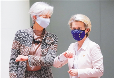 12月11日,在比利时布鲁塞尔,欧洲央行行长拉加德(左)和欧盟委员会主席冯德莱恩碰肘致意。