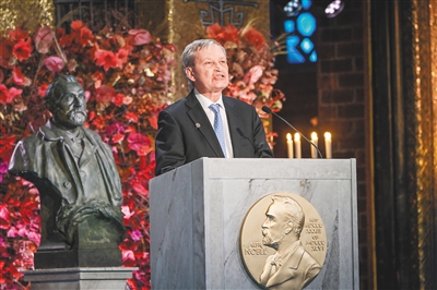 图为诺贝尔基金会主席卡尔-亨里克·赫尔丁在颁奖仪式上致辞。 新华社/法新