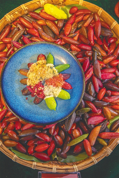 细看这手指柠檬,长度犹如成年人的半截食指,棕色、绿色、黄色等颜色各异的外皮略微粗糙,切开外皮后里头的果肉颜色更加丰富——黄色、红色、粉色、紫色、蓝色、绿色……缤纷的色彩就像打翻的染色盘,稍微一挤,粒粒果肉争相涌出。