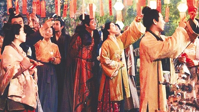 四大名著拍成的电视剧里,均有关于元宵节的片段。《西游记》中,唐僧师徒来到天竺国金平府,赶上了一场元宵灯会。神话世界里的灯会尤为瑰丽独特,灯映月,月照灯,光辉灿烂无比。灯会上,唐僧被三只犀牛精携回洞里。孙悟空搬来二十八宿中的四木禽星前来助战,擒拿到三个妖精,解救出唐僧。