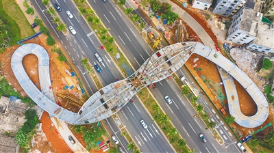 近期,海口龙昆南延长线新建两座天桥,分别位于万人海鲜广场附近和恒大旅游城附近,图为新建的2号天桥俯视图。两座天桥桥梁主要采用钢箱梁变截面结构形式,设计上融入海洋元素,分别呈现海浪和飞鱼造型,建成后将保障龙昆南延长线两边居民安全出行,缓解交通压力。本报记者 李天平 摄