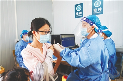 3月28日,在三亚市美丽之冠新冠疫苗临时接种点,医护人员为居民接种新冠疫苗。本报记者 武威 摄