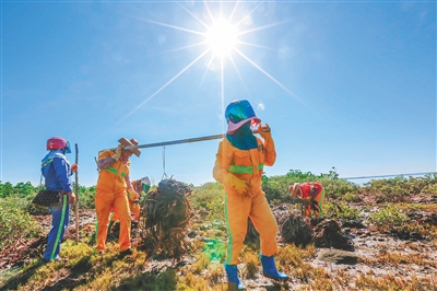 6月16日,洋浦经济开发区新英湾海滩,环卫工人正在清理红树林里的垃圾。近期正值雨季,许多垃圾被雨水冲进红树林。环卫工人及时清理,改善海滩环境卫生。