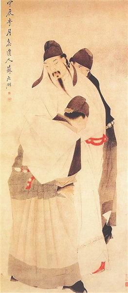 图为李白醉酒于唐玄宗宫殿之内,由内侍二人搀扶侍候的情景。(清代画家作品)