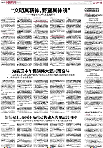 “当代中国少年儿童既是实现第一个百年奋斗目标的经历者、见证者,更是实现第二个百年奋斗目标、建设社会主义现代化强国的生力军。”站在党和国家事业发展薪火相传、后继有人的战略高度,习近平总书记不断激励新时代少年儿童接续奋进。
