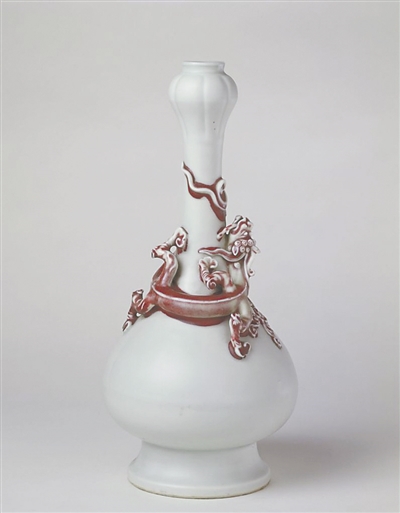 白釉塑贴红蟠螭纹蒜头瓶,明嘉靖,景德镇窑制品,高30厘米,口径2.6厘米,足径10厘米。现藏故宫博物院。瓶口呈蒜头形,细长颈,溜肩,鼓腹,高圈足外撇。瓶通体施白釉,釉质洁白细润。口部刻细线蒜瓣纹,腹部有粘接痕一周。瓶颈至肩部塑贴一条红色螭龙,曲体上仰,口衔仙草,由肩部向颈部盘绕,卷尾与首相接,四肢平伏于瓶肩部。