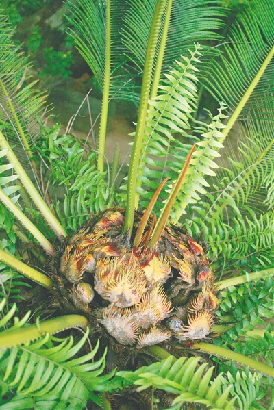苏铁属植物 苏铁属植物源于3亿多年前的晚石炭纪,是现存最古老的种子植物、濒临灭绝的“活化石”。