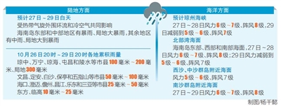 气象部门提醒,南海中部海域作业渔船及过往船只注意避开大风影响区域;预计26日夜间~29日,琼中、万宁、琼海、屯昌和陵水累积雨量100毫米~200毫米、局地300毫米,目前上述地区土壤饱和度高,需继续做好中部、东部山区地质灾害的防范工作,并加强水库安全管理。