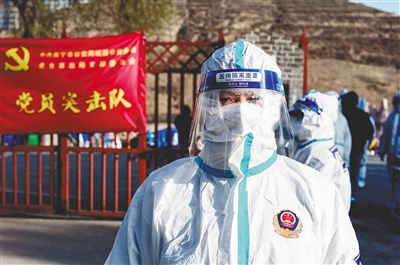 11月8日,西宁市一名执勤民警在核酸采样点维持秩序。 新华社发
