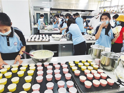 海口市西湖实验学校学生在海口旅游职业学校学习制作蛋糕。