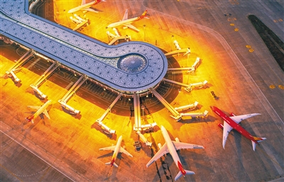 11月20日傍晚,俯瞰夕阳下的海口美兰国际机场二期扩建项目(无人机航拍画面),该项目计划于12月2日投入运营,将成为构建海南海陆空立体交通体系,加强与“一带一路”沿线国家互联互通的重要一环。 本报记者 张杰 摄