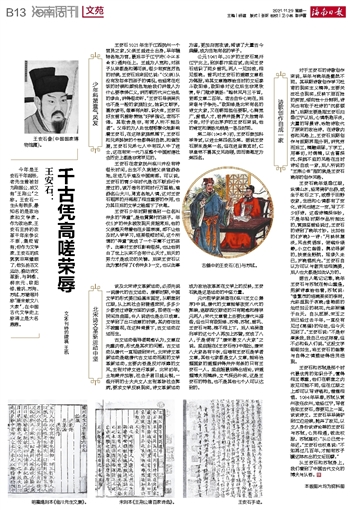 文\本刊特约撰稿 王凯今年是王安石千年诞辰,老先生曾被封为荆国公,故又有“王荆公”之称。王安石一生头衔很多,最知名的是政治家和文学家。作为政治家,王安石主持的改革千年来争议不断,褒贬皆有;但作为文学家,王安石的成就就非常耀眼了,他弘扬古文运动,推动诗文革新,与韩愈、柳宗元、欧阳修、曾巩、苏洵、苏轼、苏辙等并称“唐宋散文八大家”,在中国古代文学史上称得上是大名鼎鼎。