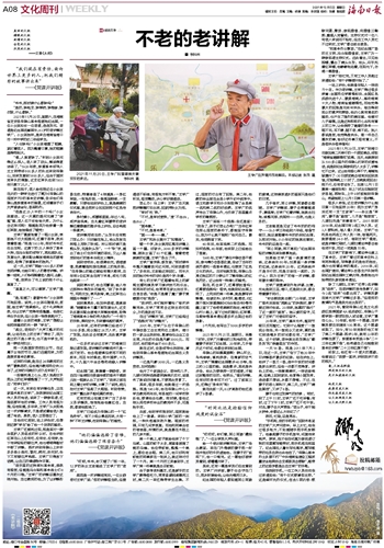 一位多次采访过王学广的海南日报记者发现,老讲解的讲解词并不是一成不变的。他会根据情况使用不同的版本,而且与时俱进,把中国梦、十九大、十九届六中全会等热词融入讲解中。