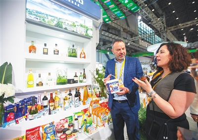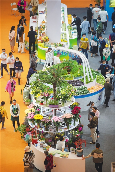 12月16日,2021年中国(海南)国际热带农产品冬季交易会在海口拉开帷幕。当天设为专业观众日,现场人流量逾2万人次。上图:12月16日,在冬交会现场,逛展观众络绎不绝。下图:12月16日,来自国外的冬交会参展商在讨论展品。本报记者 袁琛 摄