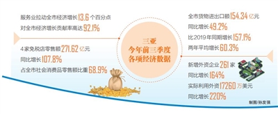 围绕打造国际旅游消费中心核心区的目标,三亚坚持新发展理念,用足用好自贸港优惠政策,加强消费促进、引进外资、会展经济等工作,加快会展业复苏,消费市场活力不断释放,外贸进出口有序健康发展。今年前三季度,该市全市社会消费品零售总额同比增长58.7%,服务业占比较上年同期提高2个百分点,拉动全市经济增长13.6个百分点,对全市经济增长贡献率高达92.1%。