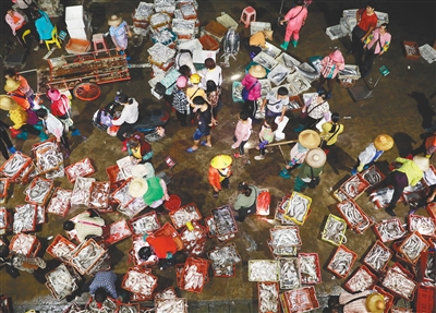 白马井渔港码头,人们分拣鱼获。