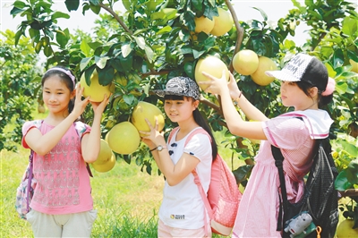 游客在儋州蜜柚树下合影。
