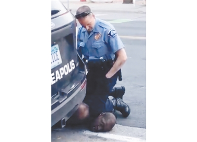 这是二○二○年五月二十五日德雷克·肖万在执法过程中以膝盖压住弗洛伊德时的资料照片。 新华社/美联