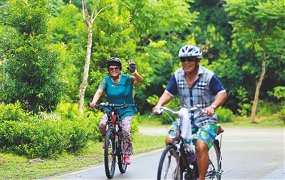 游客在万宁兴隆热带花园的绿道上骑行。 海南日报记者 张杰 摄