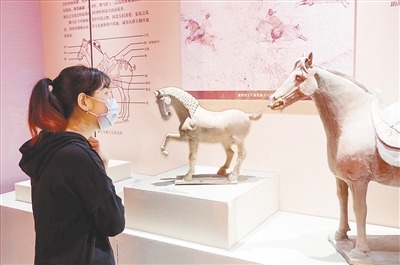 此次展出的白陶舞马出土于陕西省咸阳市礼泉县张士贵墓。舞马通体细腻如象牙一般,形体矫健,姿态优美,是中国美术史上不可多得的佳作。据姜涛介绍,舞马表演起源于西方,魏晋南北朝时传入中原,是当时马戏表演的一种。唐代是舞马的发展顶峰时期,规模宏大,尤其是进入表演最后的高潮阶段,有百匹舞马随着乐曲节奏奋首鼓尾,欢腾舞蹈,被视为盛世祥瑞之兆,深受人们喜爱。