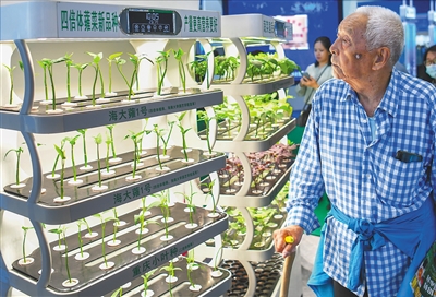 来自海南大学园艺学院的智能种菜机吸引逛展老人的目光。