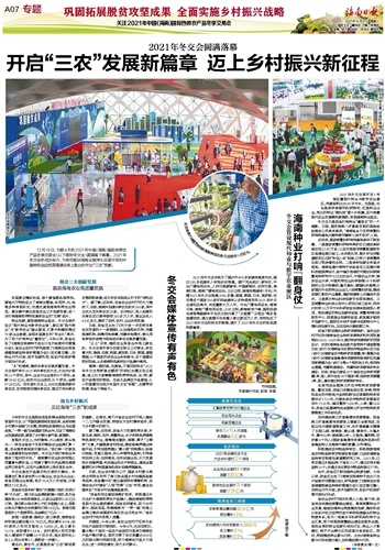 12月19日,为期4天的2021年中国(海南)国际热带农产品冬季交易会(以下简称冬交会)圆满落下帷幕。2021年冬交会的成功举办,为有效推动海南全面深化改革开放和中国特色自由贸易港建设再上新台阶作出“三农”贡献。展会三大创新发展
