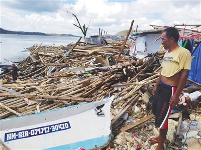 12月19日,在菲律宾北苏里高省锡亚高岛,一名男子站在台风“雷伊”过后留下的废墟旁。菲律宾国家警察20日通报说,台风“雷伊”在该国造成的死亡人数已升至375人,500人受伤,另有56人失踪。 新华社/美联