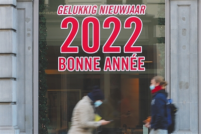 十二月二十二日,行人经过比利时布鲁塞尔一扇贴有“新年好”字样的橱窗。新华社发