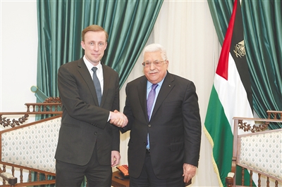 12月22日,巴勒斯坦总统阿巴斯(右)在约旦河西岸城市拉姆安拉与到访的美国总统国家安全事务助理沙利文握手。