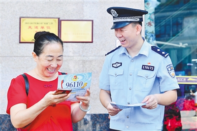 海南公安构建全民反诈格局,牢牢守住百姓“钱袋子”。图为民警在进行反诈骗宣传。