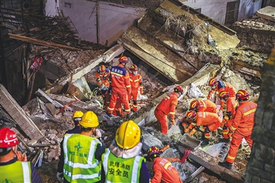 参与救援的消防指战员告诉记者,他们赶到现场时看到食堂所在的一栋二层高小楼已被夷为平地,砖块、预制板、房梁等散落一地。“坍塌房屋使用的是沙砖,建造年代较为久远,整体强度相对较弱。”