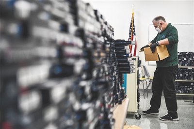 图为1月8日,在美国佛罗里达州迈阿密,戴德县公共图书馆工作人员整理新冠病毒自检盒。 新华社/法新